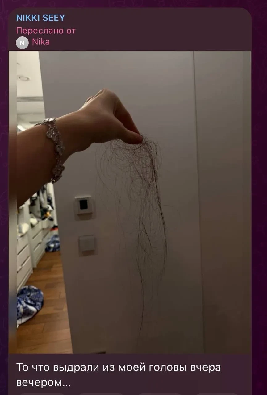 "Схватил меня за волосы, очень сильно держал меня и выдрал клок волос. Мне стало страшно: вдруг ударит! Слава богу, до этого не дошло. В полицию обращаться не буду: нет ресурса", — рассказала она порталу "Sport24". В своих соцсетях она отметила, что Муми "делал это, чтобы уничтожить её до конца". "Говорил лишь о своей репутации и как я плохо поступила, что выставила это [в телеграм-канал]", — заявила Ника. После этого футболист выгнал её из их квартиры.