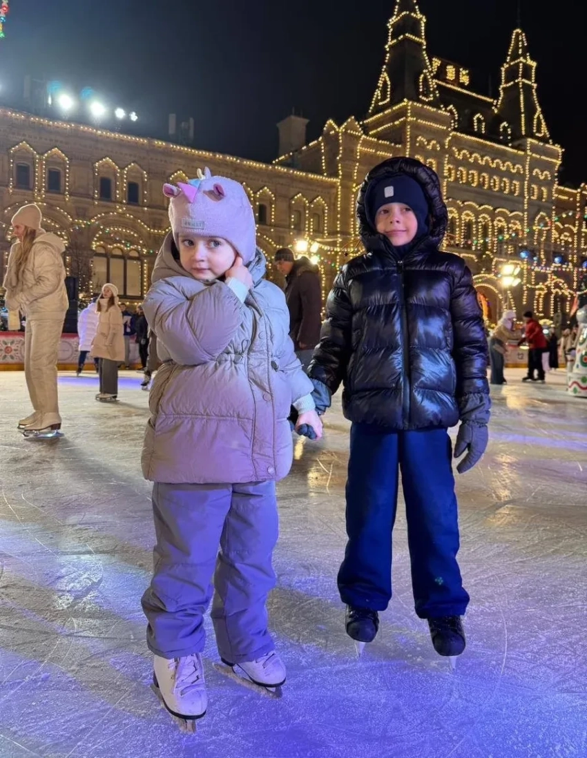 Дочь и сын Артёма Михалкова и Дарьи Баженовой"Стало традицией встречаться в новогодние дни на катке. Приходят все: и маленькие дети, и взрослые. Когда-то я приходила одна, с детьми, внуками, а в этот раз обещали привезти и правнука. Праздник для всех!" — подписала фото Татьяна Михалкова.