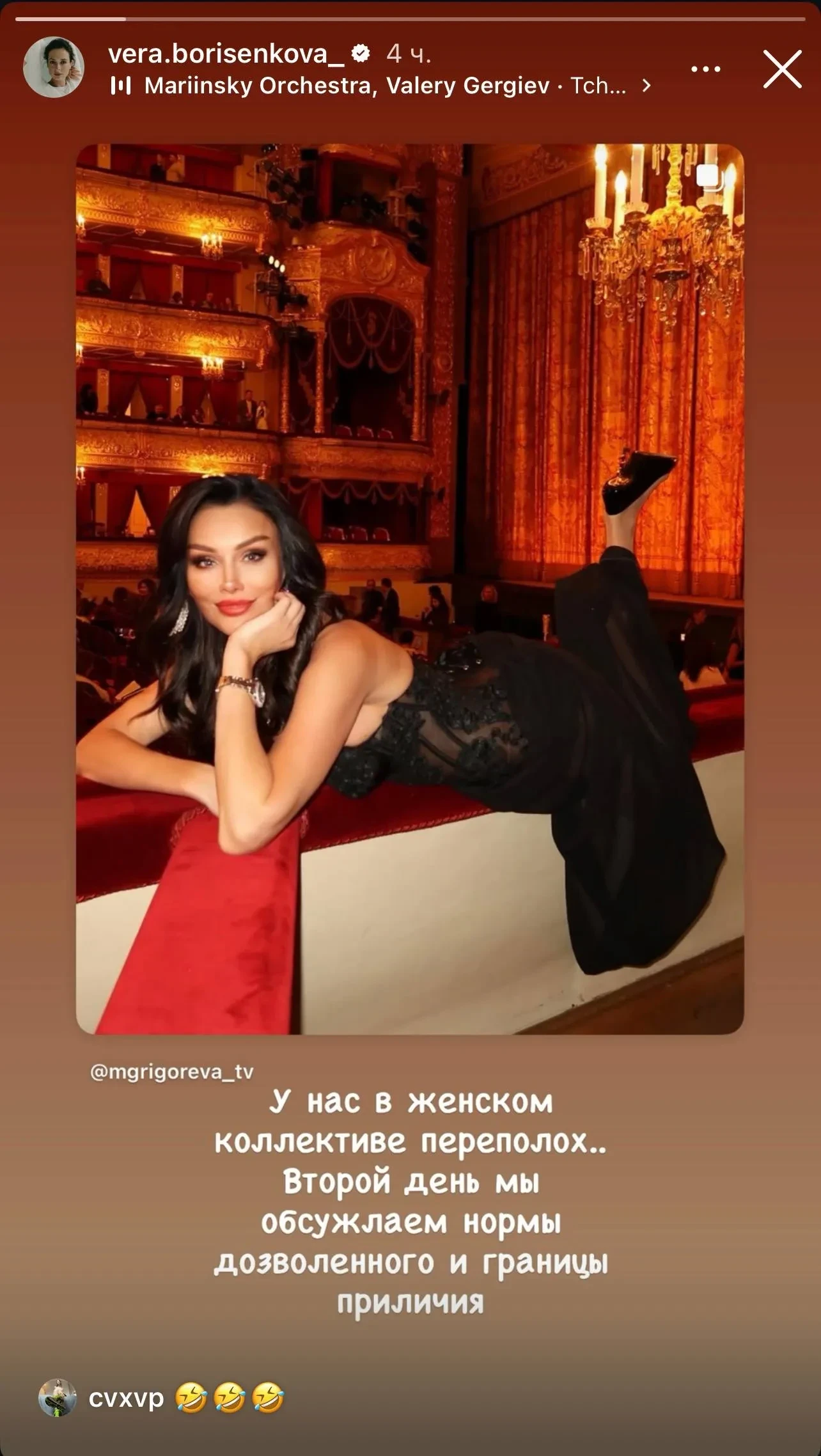 Несколько дней назад Григорьева, которая, судя по её соцсетям, часто посещает театры, выложила серию снимков с балета "Дочь фараона". Среди них оказалось фото, где она лежит на бортике ложи. Более того, позже выяснилось, что это не единственный подобный кадр в её профиле.