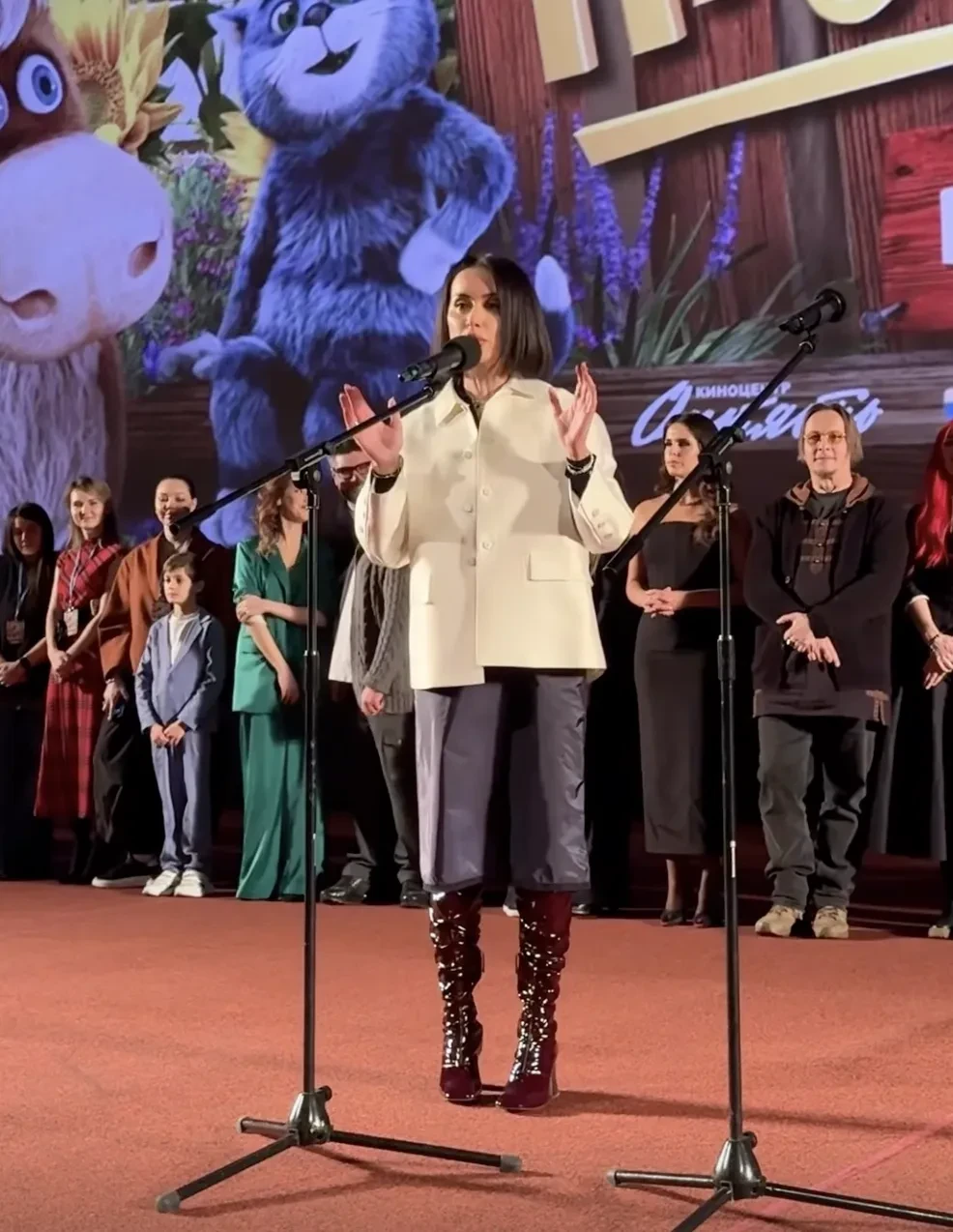 50-летняя Тина Канделаки вышла на дорожку в белом жакете и чёрной юбке, дополнив образ лаковыми сапогами и сумкой Schiaparelli. 30-летняя исполнительница одной из главных ролей в фильме и жена режиссёра Сарика Андреасяна Лиза Моряк пришла в чёрном платье и туфлях на каблуках в компании мужа и дочерей.