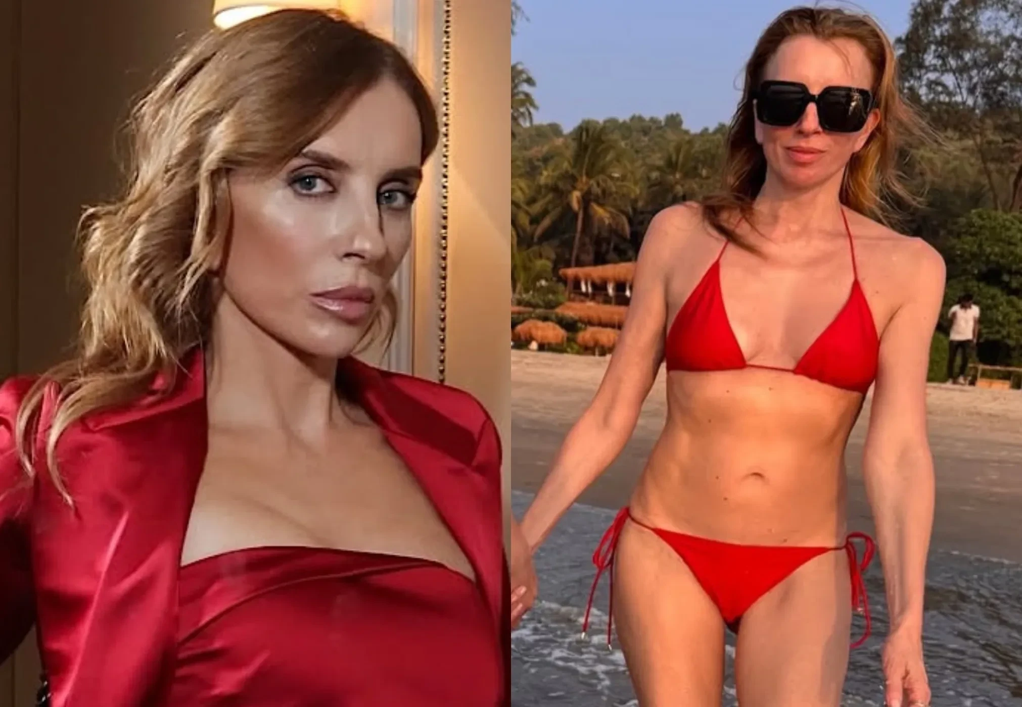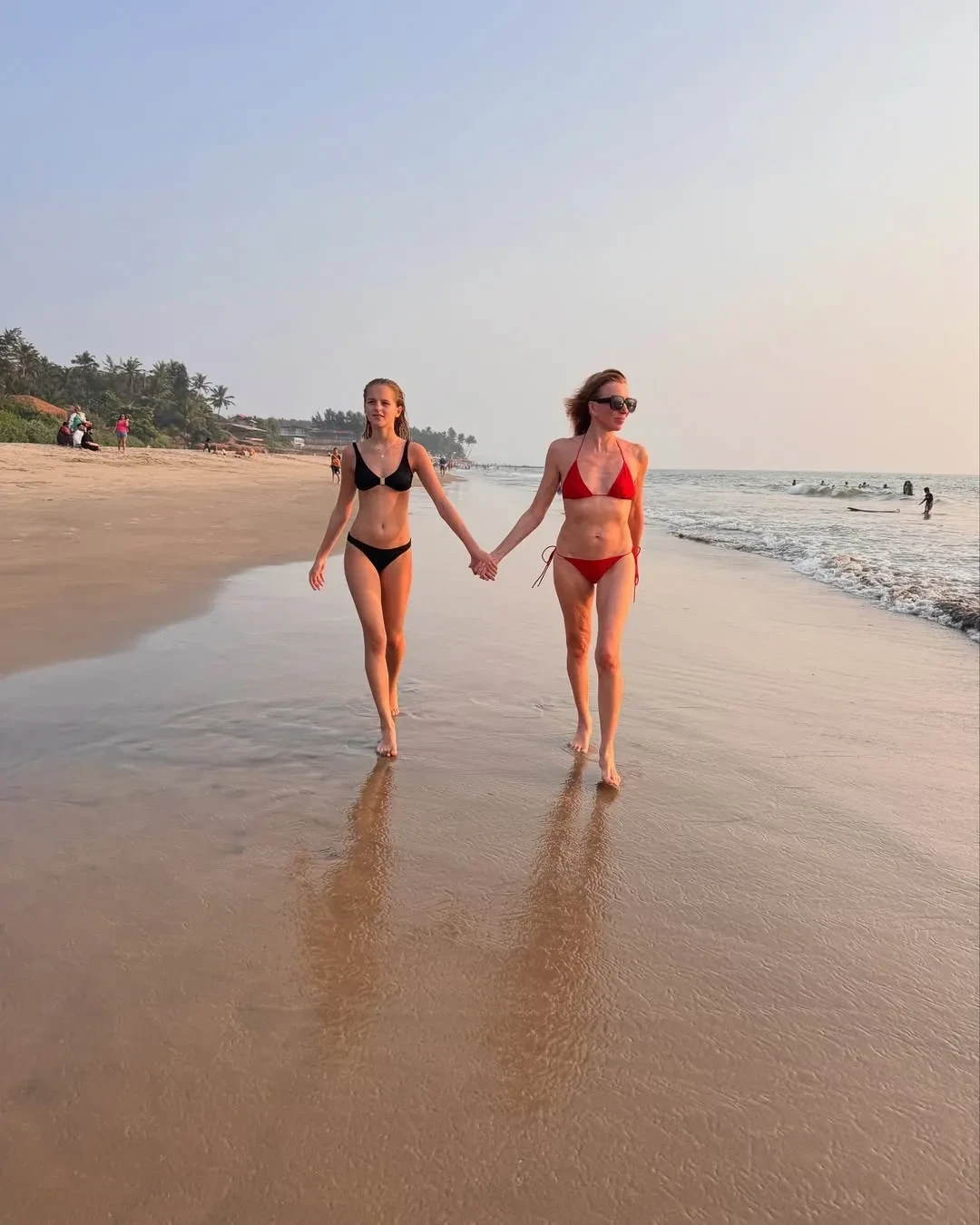 На снимках Бондарчук позирует на пляже в красном бикини Lavarice одна и в компании 13-летней падчерицы Юнны — дочери её мужа Сергея Харченко.