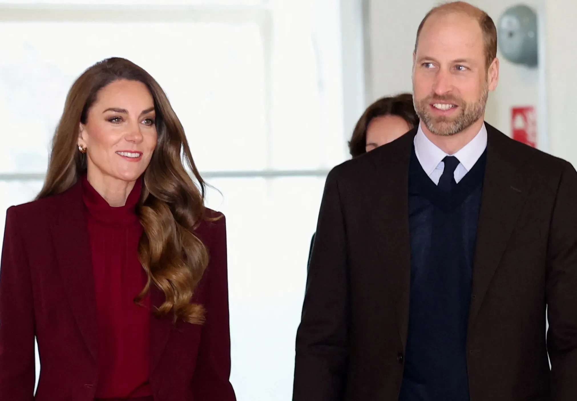 44-летняя принцесса Уэльская появилась на публике в бордовом брючном костюме и туфлях в тон, а 43-летний принц надел рубашку с галстуком, свитер, пиджак и замшевые ботинки. Супруги встретились в больнице с медицинским персоналом и отметили работу Национальной службы здравоохранения в напряжённый зимний период.
