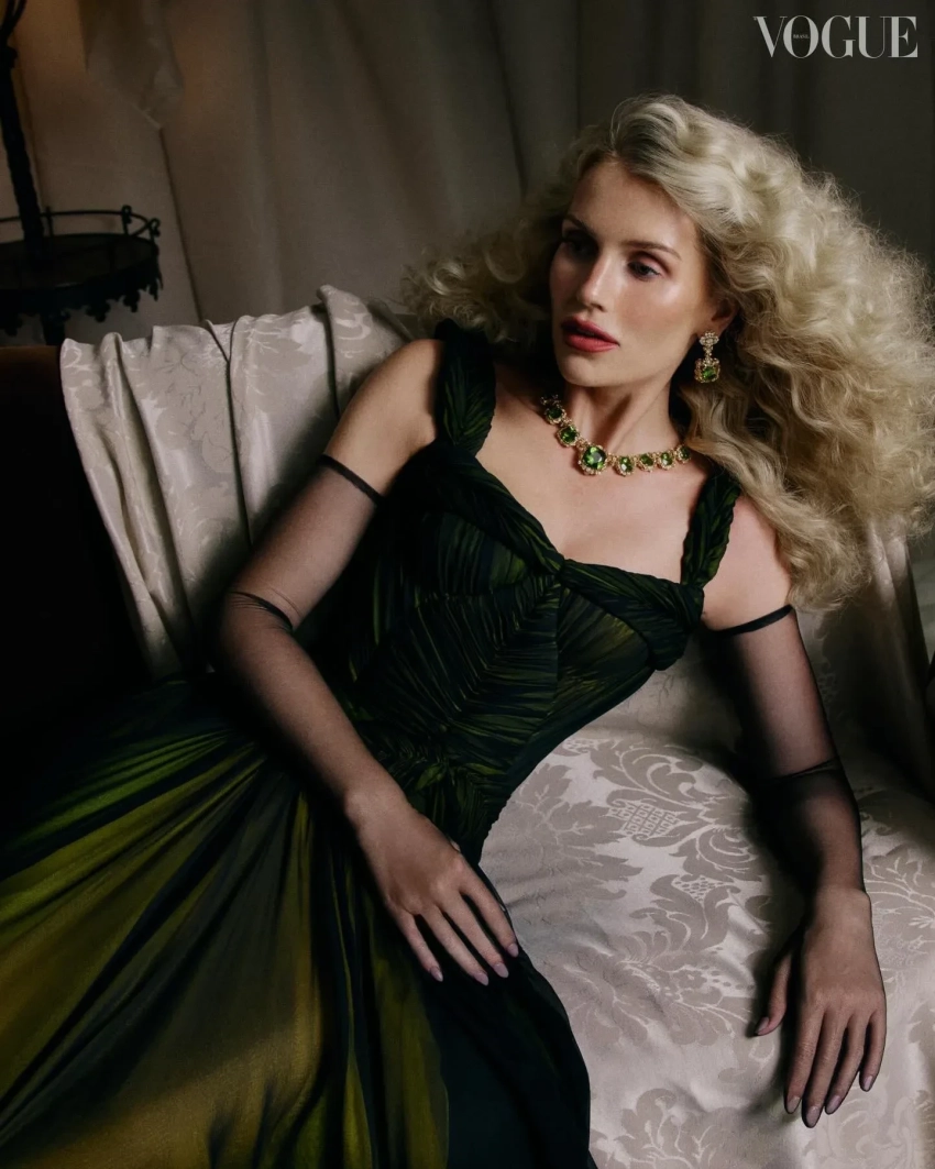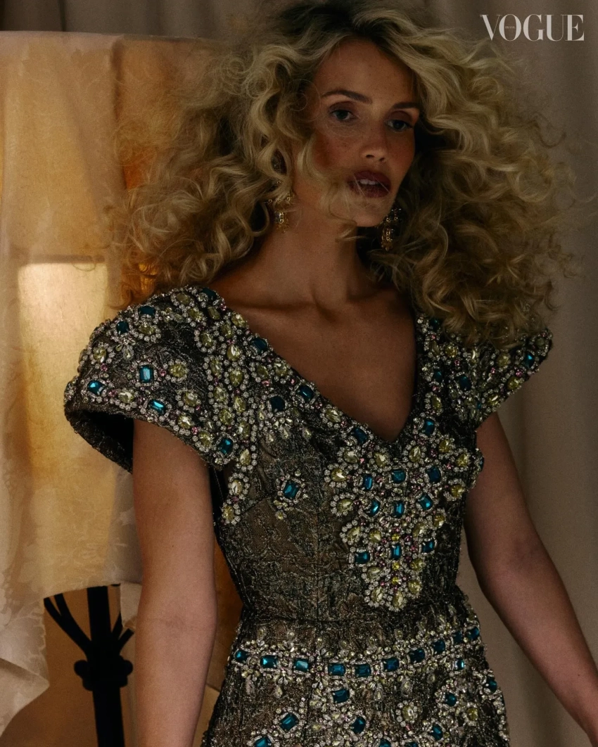 В объективе фэшн-фотографа Хорхе Эвальда 35-летняя британская аристократка позирует в нарядах и украшениях от Dolce & Gabbana. Специально для съёмки ей сделали объёмную прическу с мелкими кудрями, а также макияж с акцентом на губы.