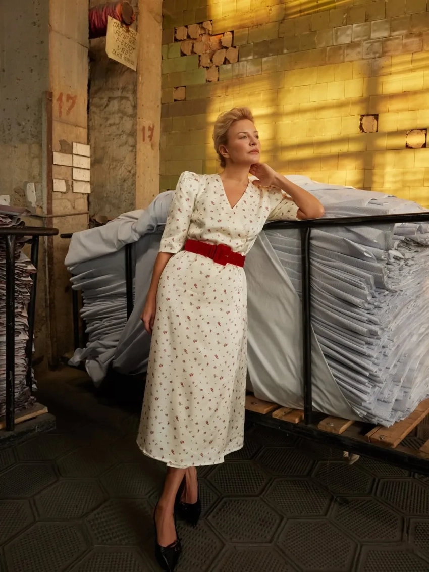 Виктория Шелягова в фартуке и сарафане снялась на швейной фабрике