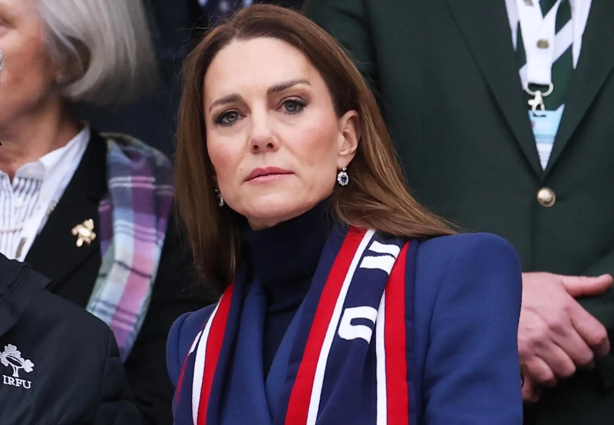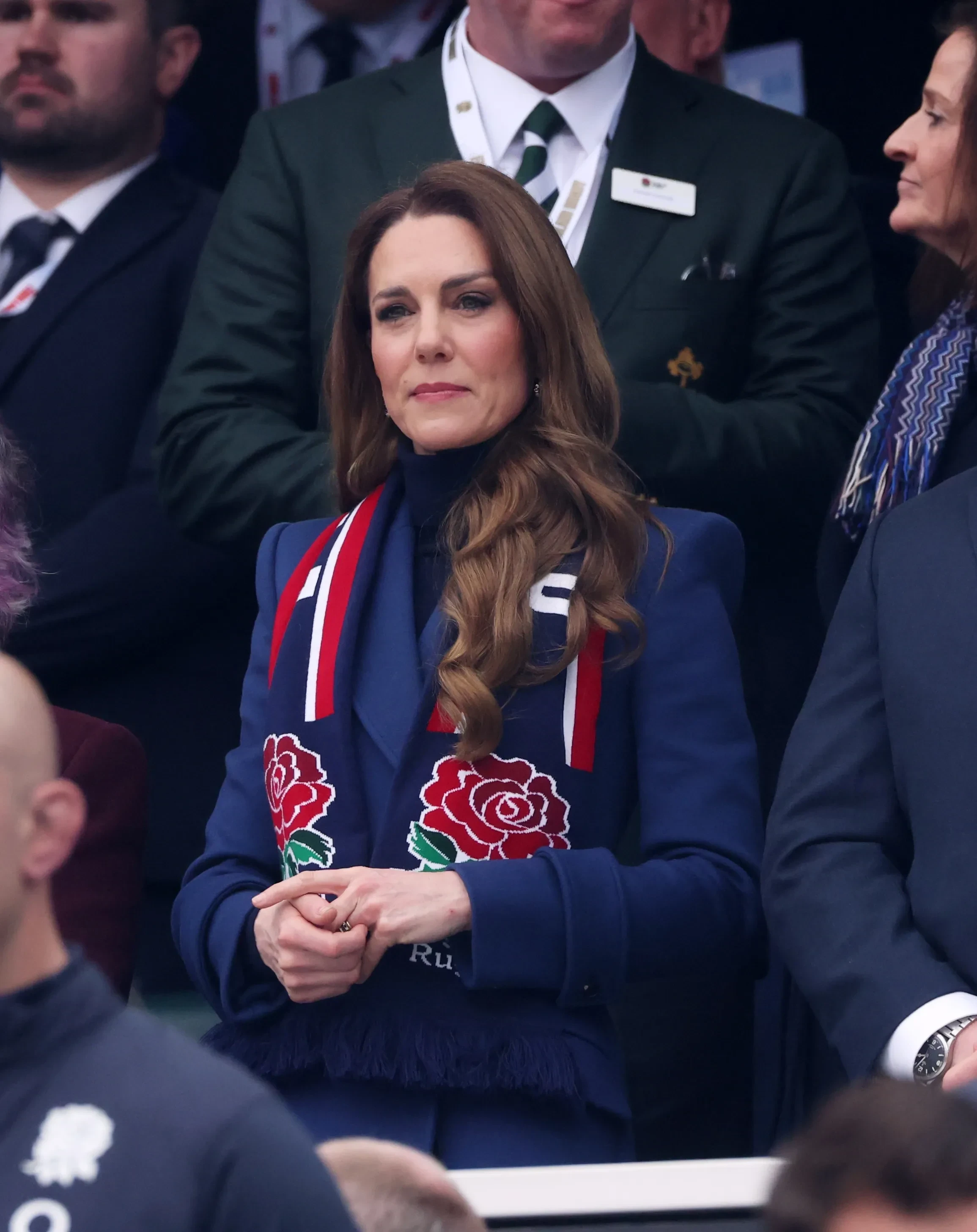 Принцесса Уэльская пришла на игру без мужа, принца Уильяма, и в своём любимом двубортном пальто синего цвета Alexander McQueen, которое она уже надевала не один раз. Кейт Миддлтон дополнила образ кожаными перчатками и шарфом с большими красными розами — логотипом английской команды.