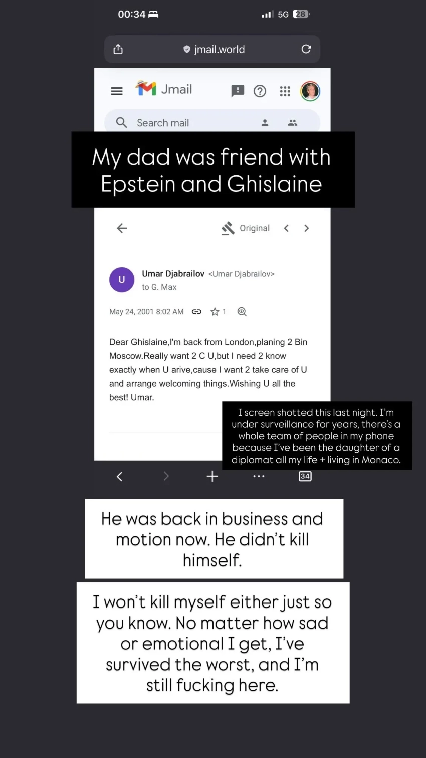 "Мы созванивались несколько дней назад. Он не покончил с собой, его заставили замолчать из-за связи с Эпштейном и Трампом", — отметила она, добавив, что Джабраилов дружил с финансистом и его пособницей Гислейн Максвелл. В подтверждение своих слов Альвина показала скриншот сообщения отца, отправленного Максвелл.