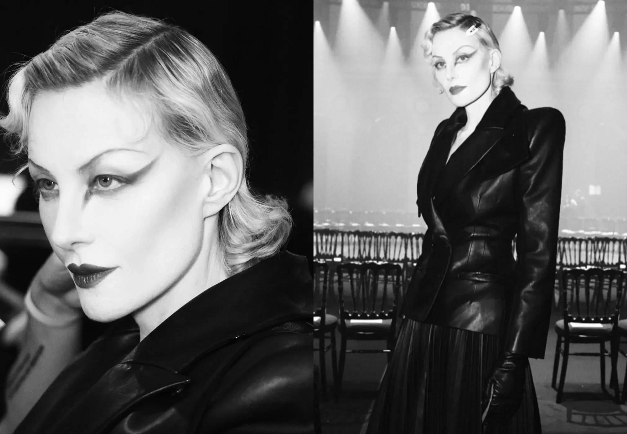Рената дефилировала в чёрном кожаном жакете с объёмными плечами и плиссированной длинной юбке. Образ дополняли сапоги и перчатки, а финальным штрихом стал макияж в готическом стиле с длинными стрелками и алыми губами.