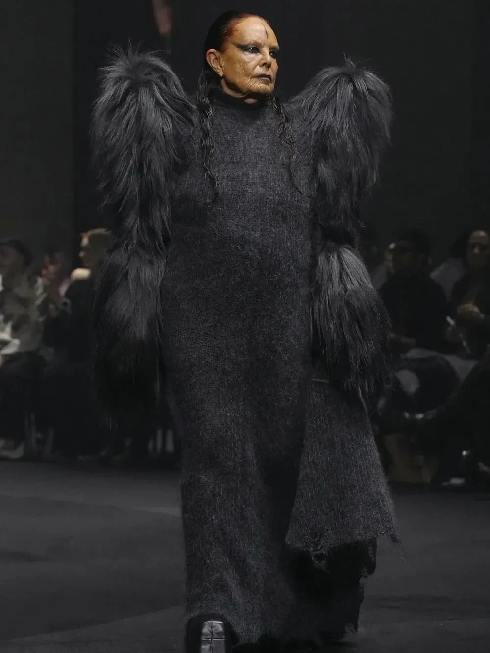 Показ Matières FécalesВ качестве модели на подиум также вышла 81-летняя Мишель Лами. Супруга и муза дизайнера Рика Оуэнса закрывала показ.