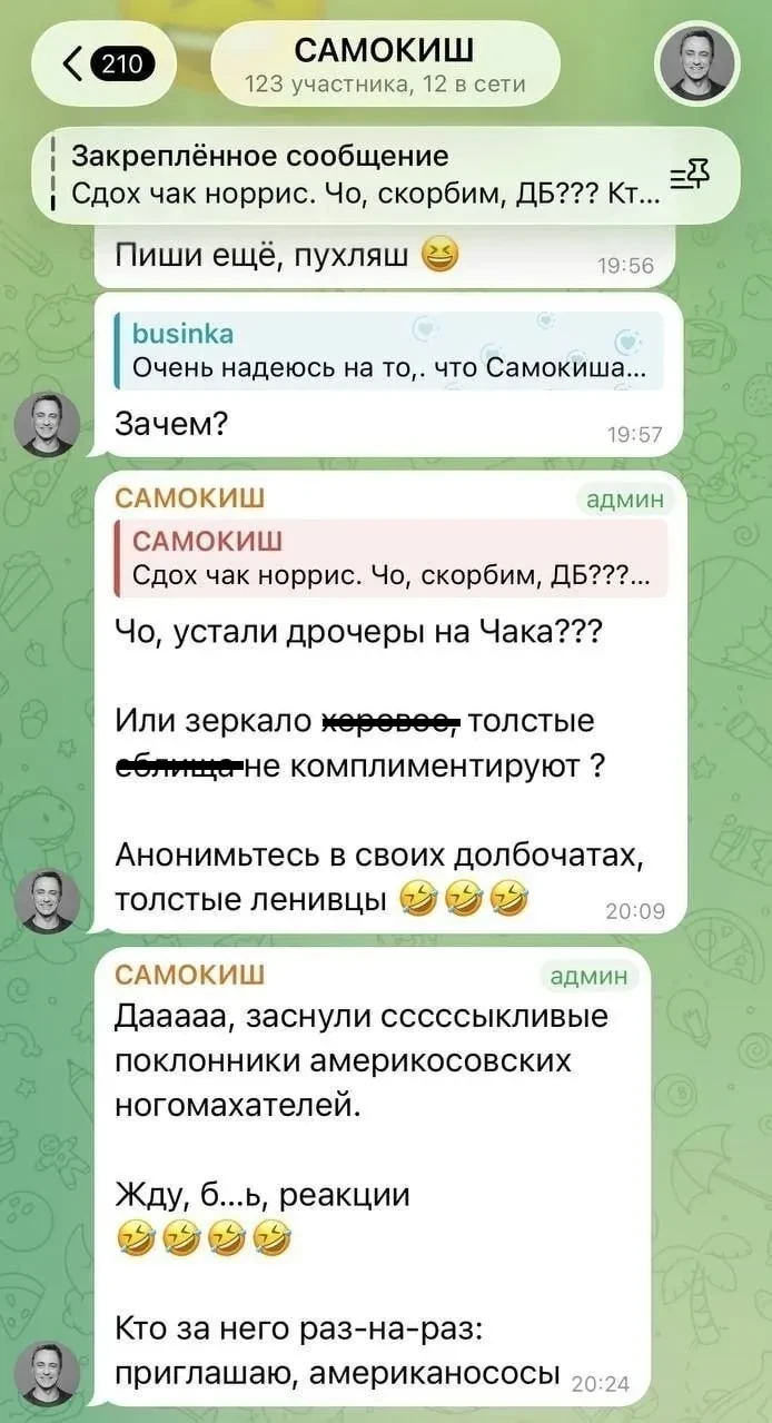 "Сдох чак норрис. Чо, скорбим, ДБ?" — говорится в публикации, опубликованной от имени Самокиша (орфография и пунктуация автора здесь и далее сохранены. — Прим. ред.).